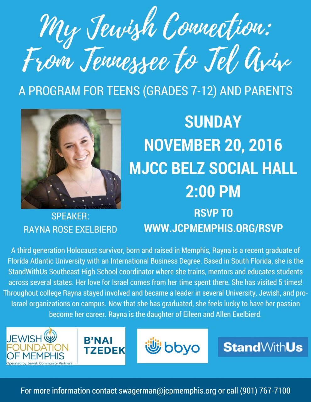 Join us on Sunday, November 20 at 2pm for a special program for teens (grades 7-12) and parents. Hear from former Memphian, Rayna Exelbierd, as she shares her story of how her involvement in B’nai Tzedek and BBYO led to her becoming a leader on her college campus and a career with StandWithUs.