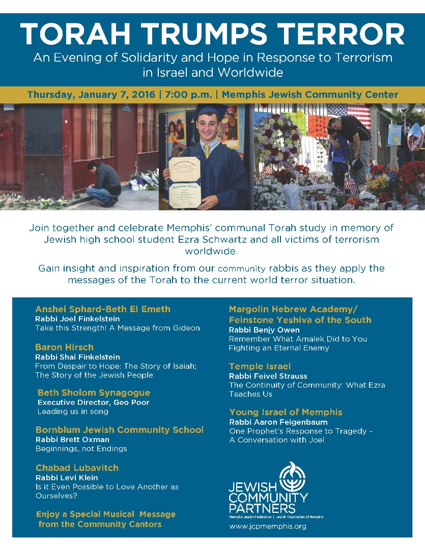 Please join all Memphis congregations and day schools for an evening of solidarity and hope in response to terrorism in Israel and worldwide, Thursday January 7, 7pm at the MJCC. We will mark the completion of our communal Torah study, pay tribute to terrorism victims worldwide, and draw inspiration from the remarks and music of our community’s spiritual leadership. For more information, contact Jewish Community Partners.