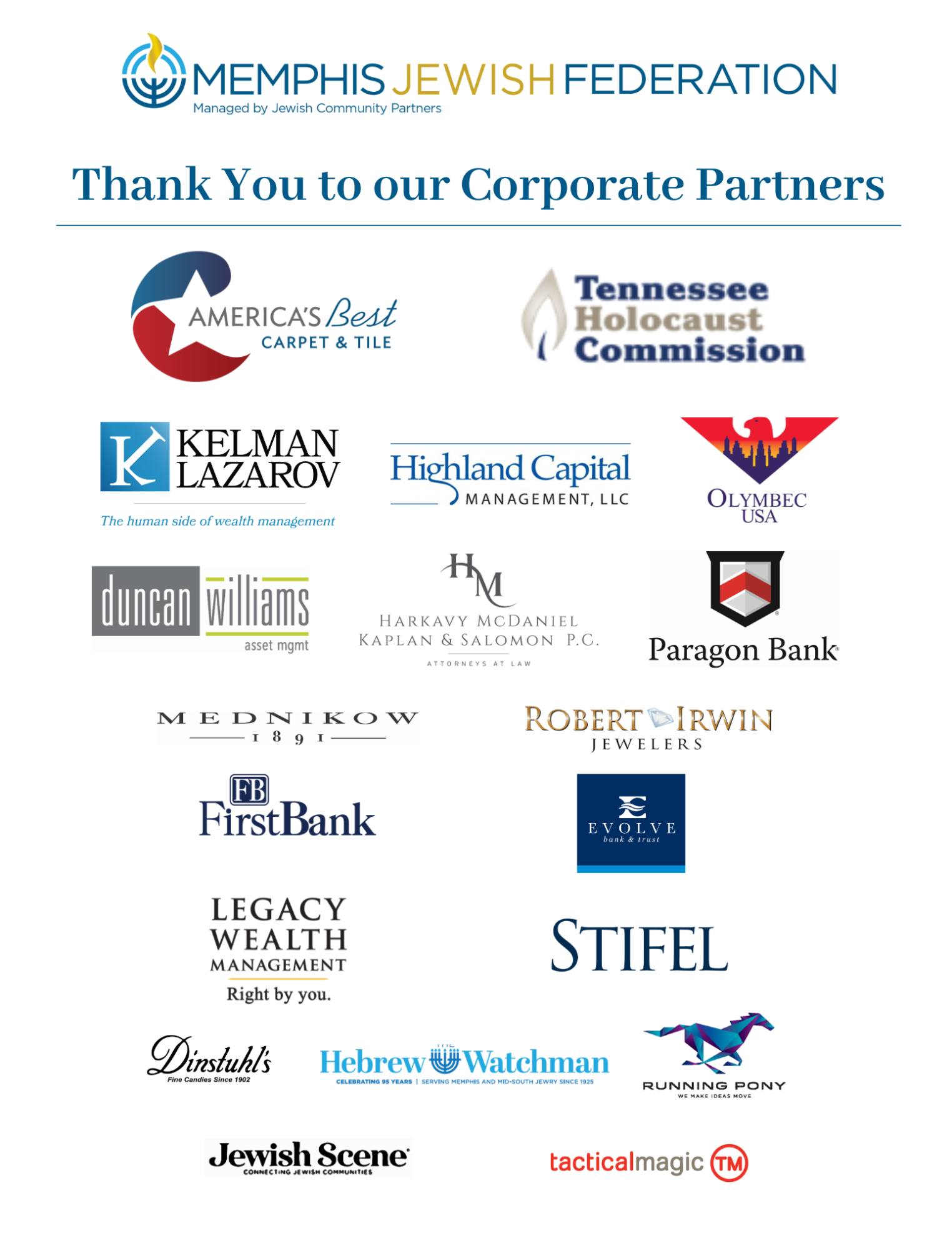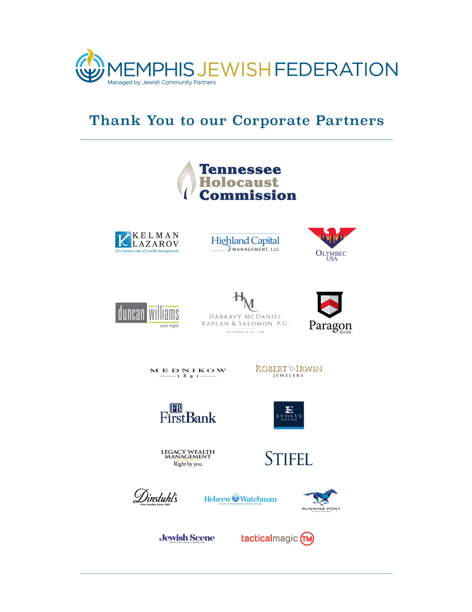 Business community support is an integral part of the Jewish communal network. supported by the Memphis Jewish Federation. The Federation thanks its corporate partners for their generous participation.