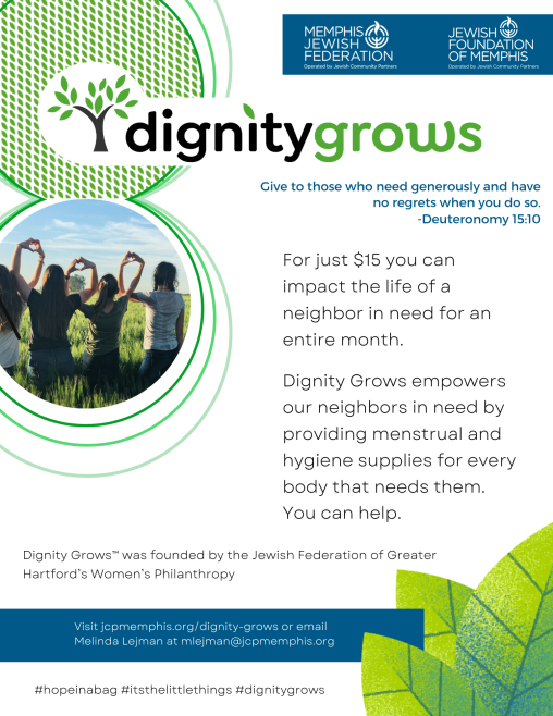 The Jewish Foundation of Memphis and Memphis Jewish Federation are partners in addressing this critical need in our community. As a Dignity Grows Chapter, we help community members get involved through education, volunteering, and sponsorship opportunities.