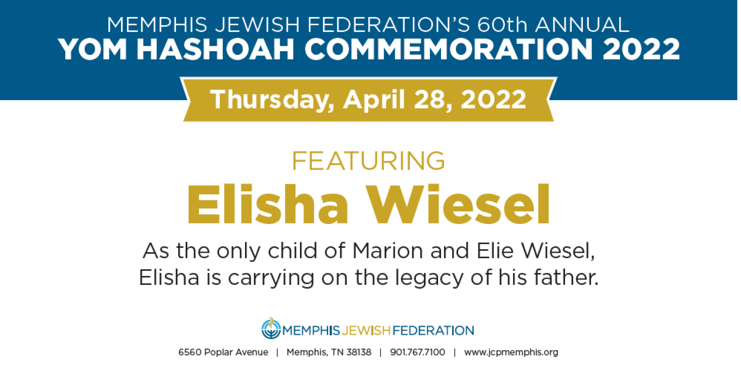 Memphis Jewish Federation’s 60th annual Yom HaShoah Commemoration will feature Elisha Wiesel, son of Nobel Laureate, Holocaust survivor, and memoirist Elie Wiesel, “in conversation” with Rabbi Abe Schacter-Gampel of Memphis Jewish Home & Rehab (MJHR). Advance registration for in-person or virtual attendance is required.